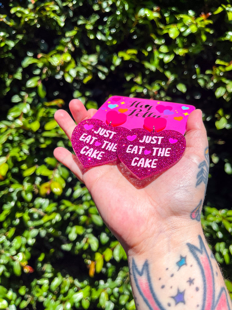 "Just Eat The Cake" Heart (Dangles) Pink/Glitter