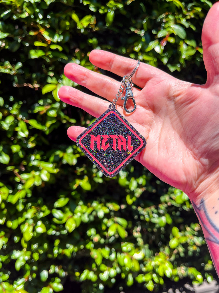 Metal Warning Sign (Keyring) Black Holographic Glitter - Red